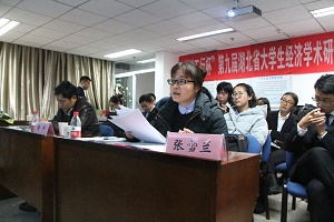 第二会场则是由中南财经政法大学张雪兰教授和我校经济学院喻平教授担任评委,参赛者分别以经济增长方式转变、旅游、金融对产业升级的影响等为主题撰写论文。两位教授认真的听了每组选手的论文答辩,细致入微地指出了每一篇论文的优点和可待改进的地方。就选手们论文中的一些亮点,提出了更深层次的问题,进行提问研究。