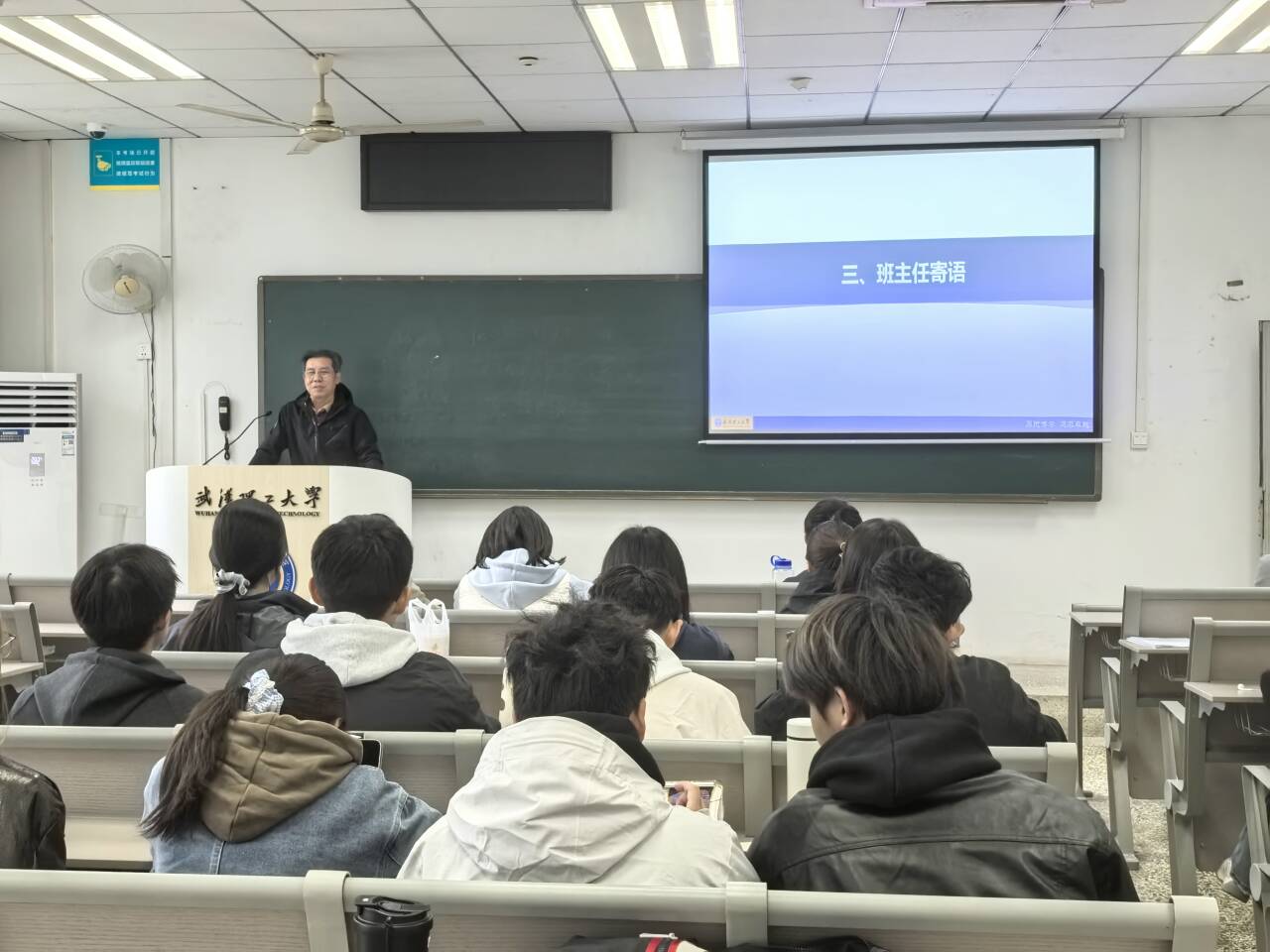 班会伊始,金融sy2301班班主任王仁祥老师围绕“理工精神与经济学专业的关联”及“大学学风建设中纪律约束的重要性”两大主题展开剖析。结合学校百余年来办学历史与服务国家战略的辉煌成就,增强同学们对学校文化的认同感与自豪感;此外,王老师通过讲述“理工故事”,引导同学们从榜样典范中汲取精神力量,对标先进模范,攻坚克难,勇攀高峰。王老师进一步强调:明确理工精神并非理工科专属,而是能为经济类专业学习提供科学思维与严谨态度的重要支撑,“以工强文”是属于理工经管学生得天独厚的优势,把握机遇积极进取,是同学们未来努力的方向。
