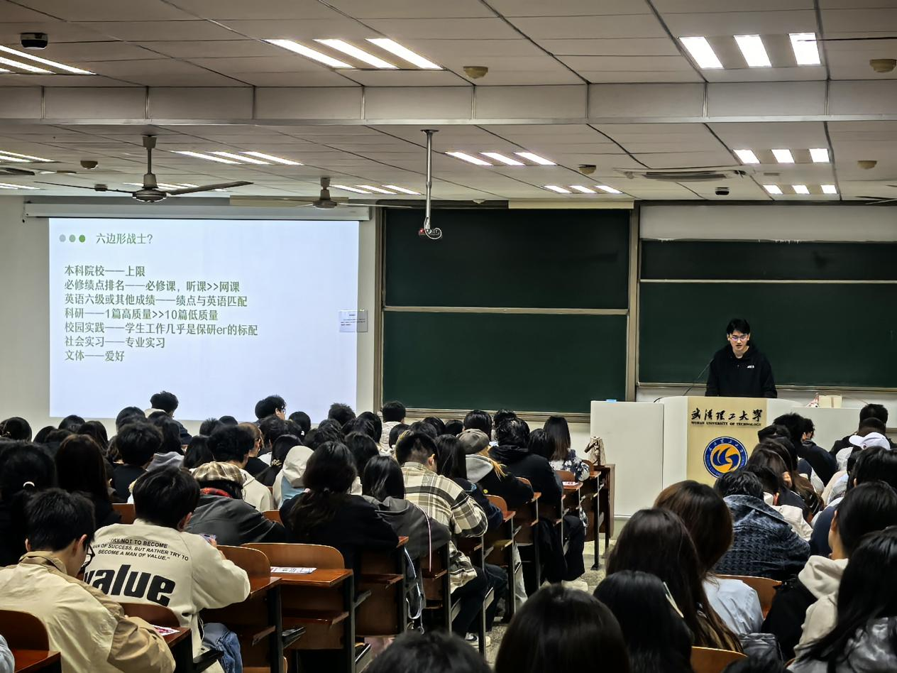 分享会上,彭宇从“自我介绍”切入,展示了自己在学业成绩、科研竞赛、社会实践等多方面的优异表现。随后,他围绕“保研政策”展开详细解读,具体介绍了推免指标分配、绩点与附加分的提升方法,以及竞赛、科研、英语等方面的加分细则。彭宇强调,保研不仅看重学业成绩,更注重综合素质的积累,建议同学们提早规划、积极参与各类活动,提升自身竞争力。