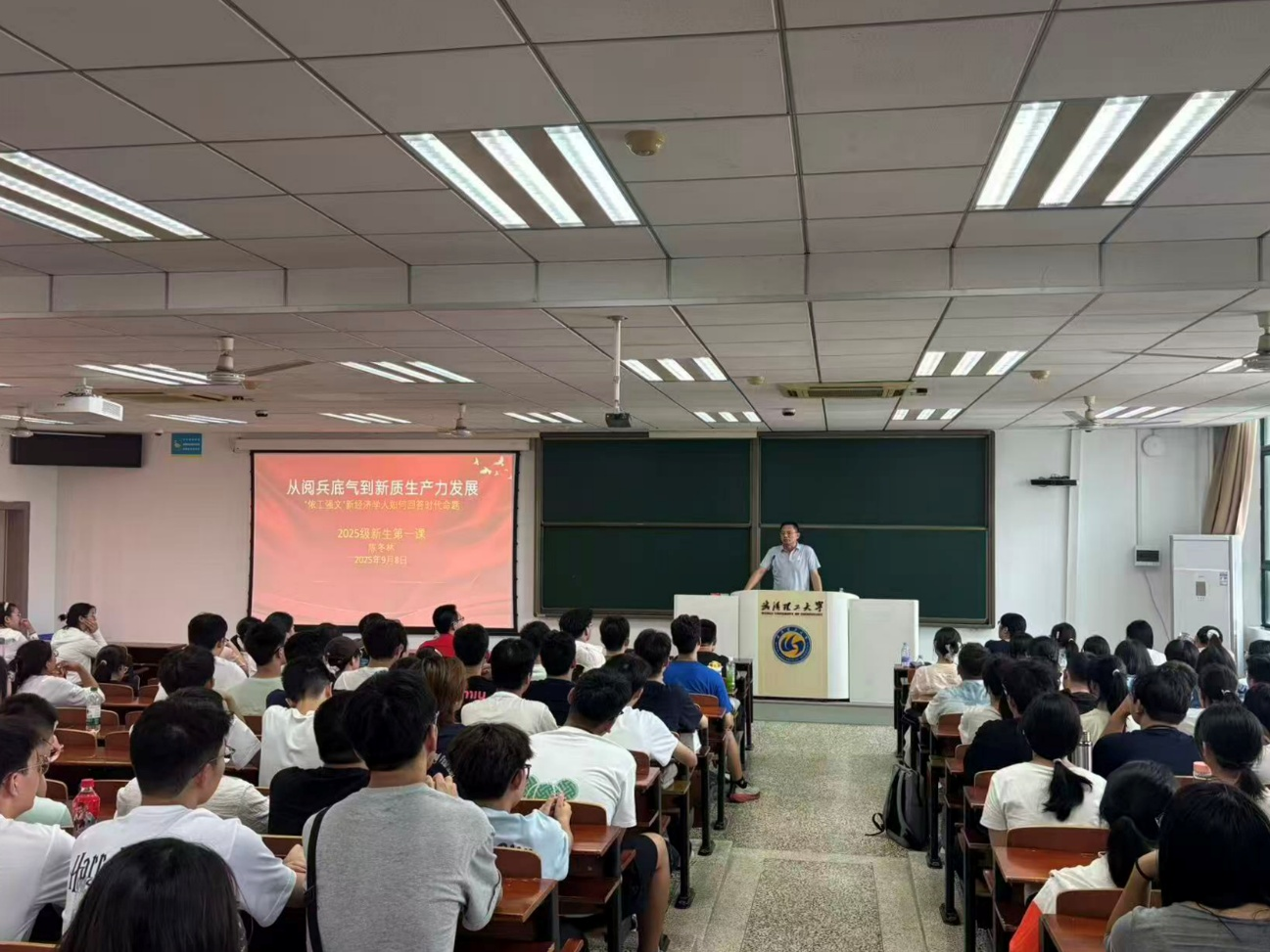 为深入学习贯彻习近平新时代中国特色社会主义思想主题教育,全面落实立德树人根本任务,引导新生坚定理想信念、明确学习目标,9月8日,经济学院陈冬林院长为2025级全体新生讲授了题为“从阅兵底气到新质生产力发展——‘依工强文’新经济学人如何回答时代命题”的开学第一课。本次“院长第一课”旨在帮助新生深刻认识经济学在服务国家发展战略中的重要地位,增强作为新时代经济学人的责任感和使命感。