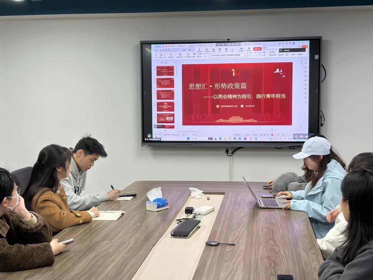 三月中旬,经济学院研究生会办公室第三期“思想汇”形势政策专题活动于学海楼1615会议室成功举办。本次活动以“以两会精神为指引,践行青年担当”为主题,经济学院研究生会指导老师曹琳卓参加,研究生会全体成员共同参与学习。活动从时代大势、两会蓝图、青年使命、团结奋斗四个维度,引导学子锚定青春方向、勇担时代重任。