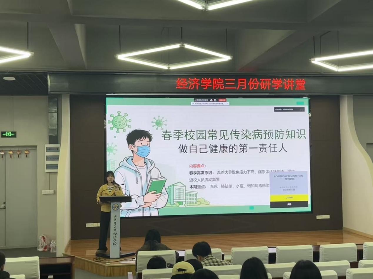 接着曹琳卓老师开展春季常见传染病预防知识宣讲。结合春季温差大、病原体活跃等特点,曹老师重点介绍了流感、肺结核、水痘、诺如病毒感染等常见传染病的传播途径与防护措施。通过对比流感与普通感冒的症状差异,强调需及时就医的重要性;针对肺结核,提醒同学们关注危险信号,并普及规范治疗与通风防护知识。
