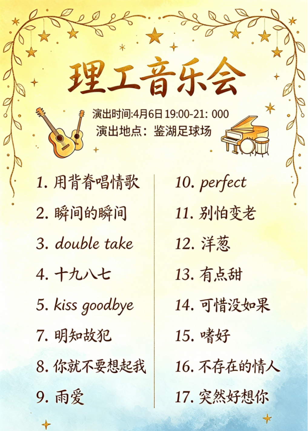 为推动校园文化多元融合,丰富学生课余生活,促进跨学院交流,4月6日晚,由经济学院、外国语学院、信息工程学院、计算机学院联合举办的学海社区“音乐接龙”音乐会在鉴湖操场温情开唱。来自各学院的音乐爱好者齐聚一堂,以歌会友、接力传唱,共同奏响春日青春乐章。
