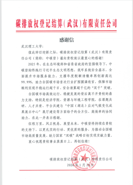 近日,经济学院收到碳排放权登记结算(武汉)有限责任公司(简称“中碳登”)发来的感谢信,对武汉理工大学在过去一年中给予的大力支持表示衷心感谢,特别对我校经济学院、资源与环境工程学院在课题共研、人才共育、平台共建以及“中国(湖北)应对气候变化成果展示中心”展厅建设等方面的协同助力予以高度评价。
