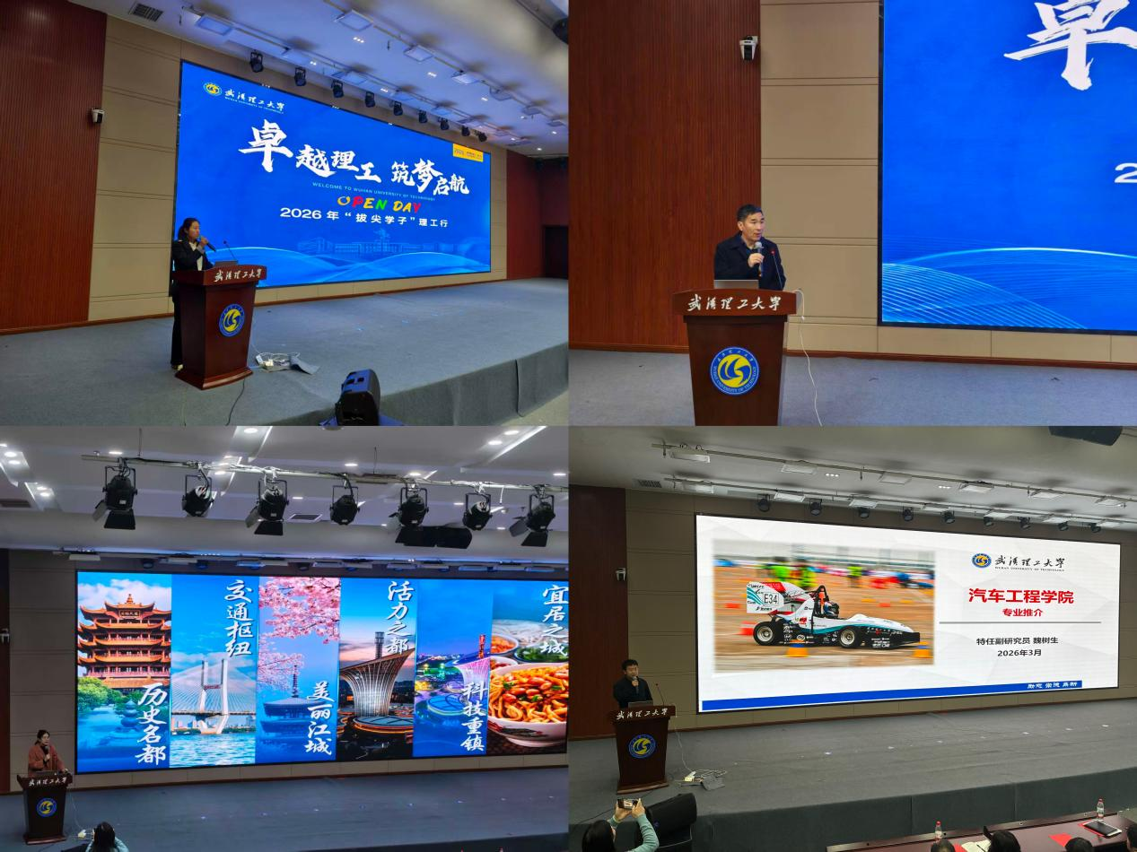 张光华书记代表学校及学院致辞,对全体师生的到来表示热烈欢迎。他介绍了学校 “厚德博学、追求卓越” 的办学理念,并对前来参观的应城一中学子寄予殷切期望。武汉理工大学招生宣传联络员王燊楠围绕学校办学历史、优势学科、招生政策等内容进行讲解,为同学们提供了清晰的升学参考。汽车学院特任副研究员魏树生以“汽车学院专业推介”为主题,结合新能源汽车、智能网联等前沿技术,生动展示了学院在产学研融合方面的实践成果。